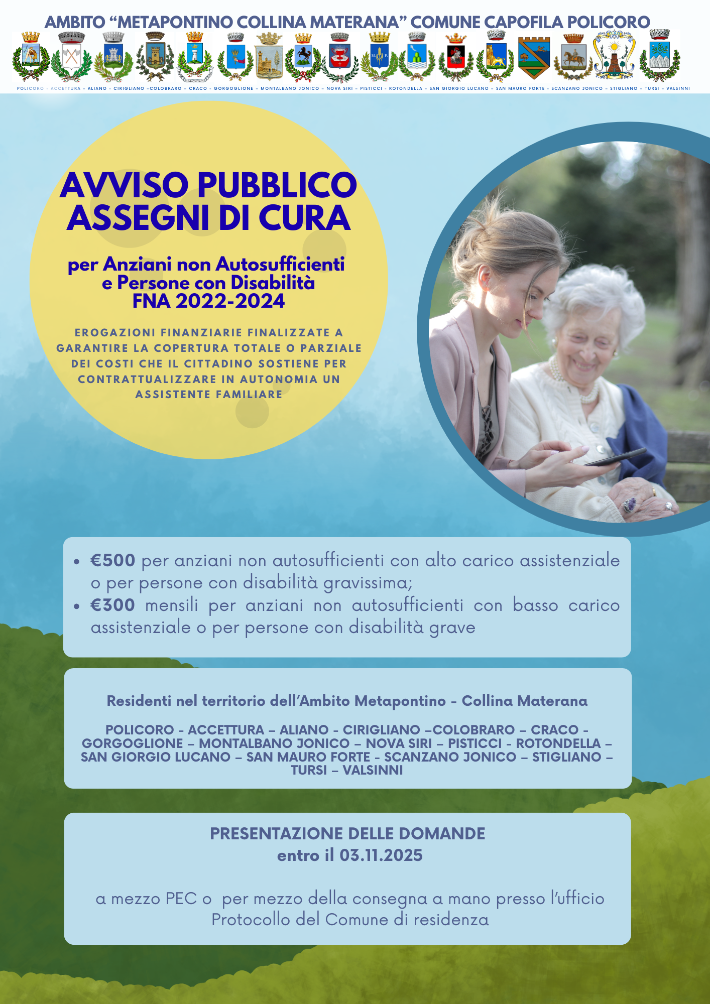 L’Ufficio di Piano, ambito “Metapontino Collina Materana”, Comune capofila Policoro, ha reso noto l’avviso pubblico per l’erogazione di “assegni di cura” finalizzati alla copertura totale o parziale dei costi che il cittadino sostiene per contrattualizzare in autonomia un assistente familiare, così distribuiti: